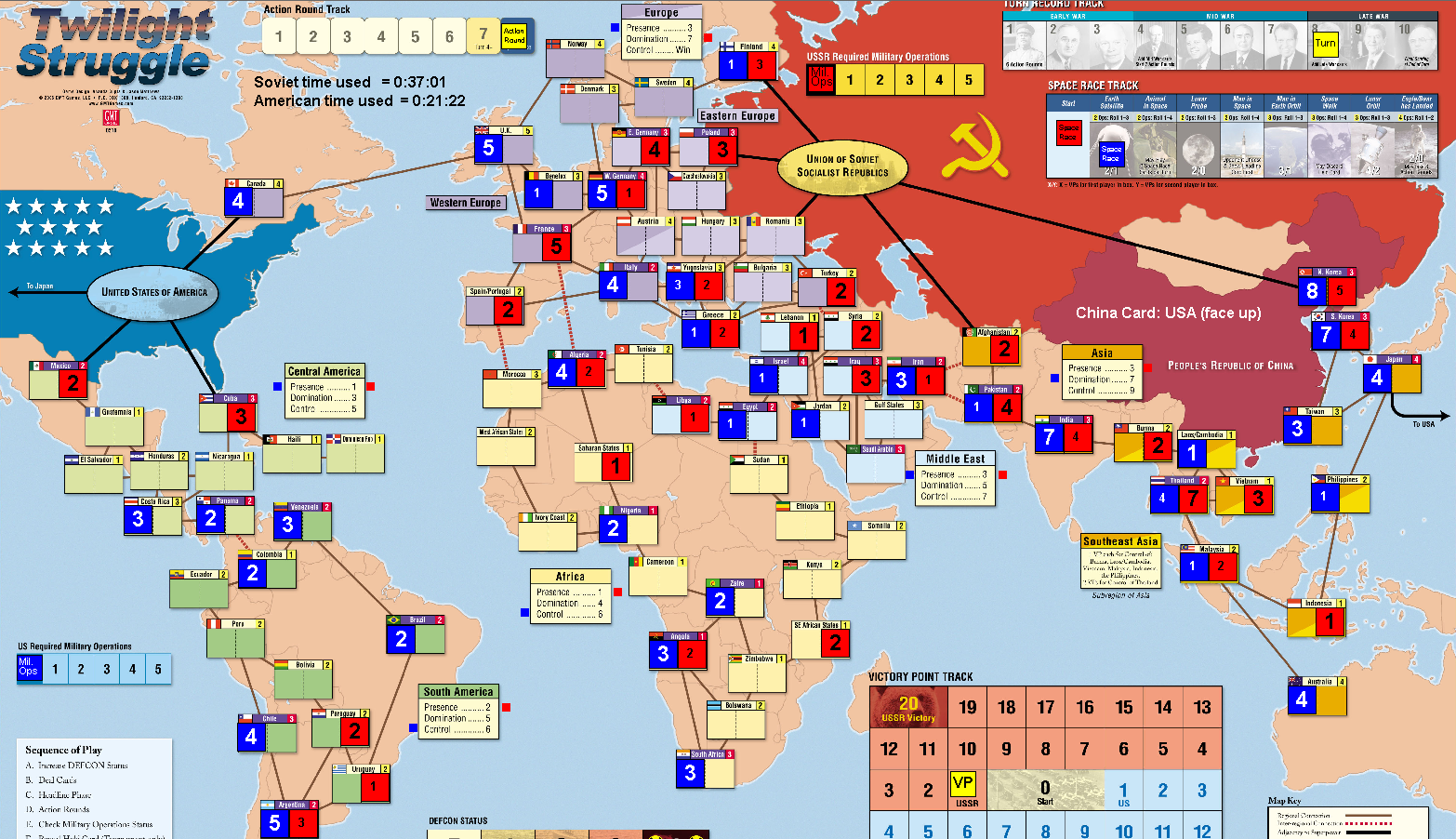 Once as a USSR player I couldn’t play Decolonization in Africa, and I still dominated the continent and won the game, thanks to coups attempts ! Here, the USSR player completely neglected Africa (he wasn’t even present at the first scoring…), it’s a big mistake !