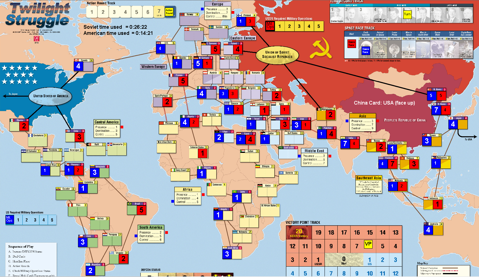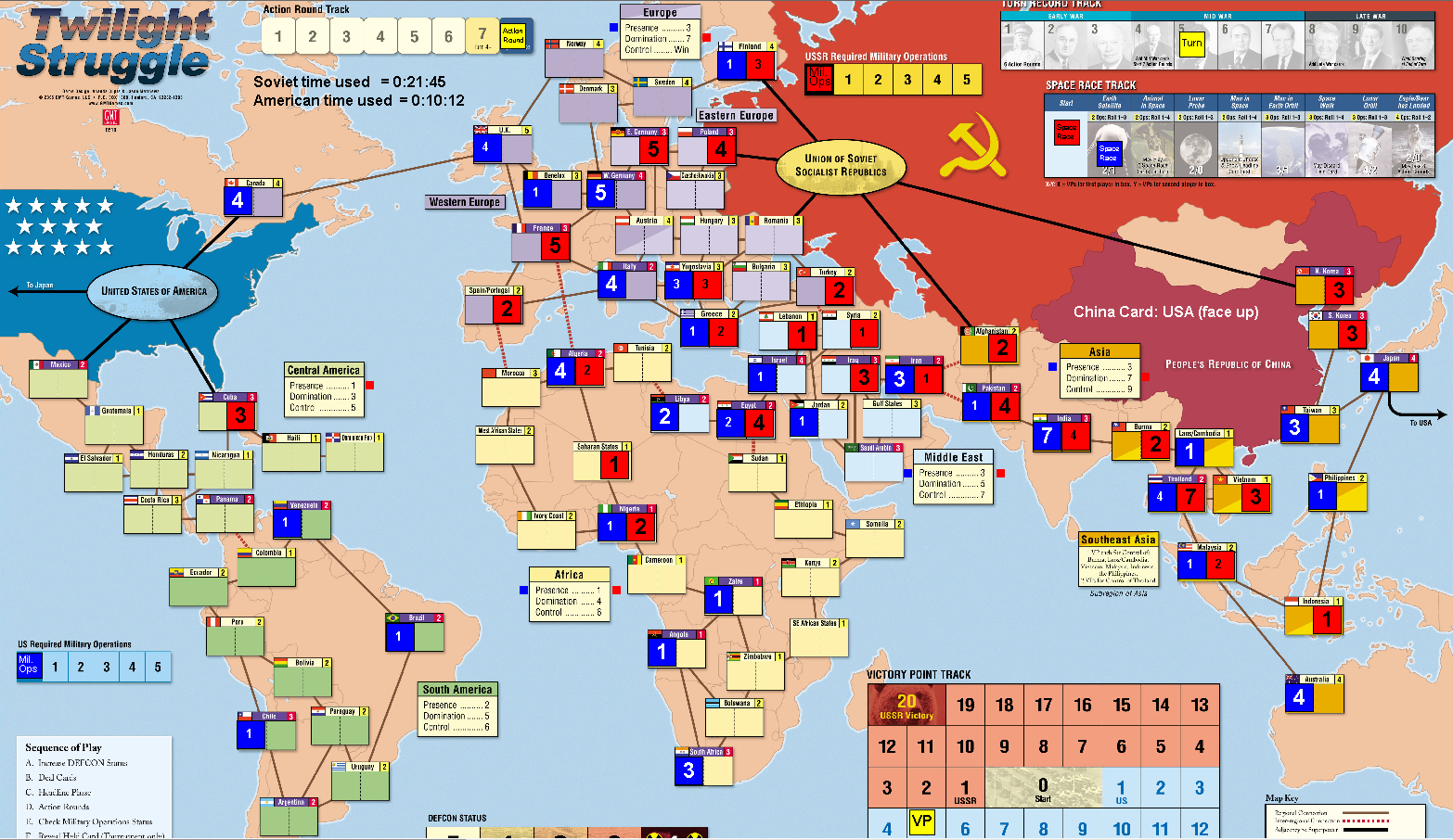I’m currently at -7VP. This is not great: usually US after Early War is hoping to be within -5 or so. -7 means the USSR is clearly ahead, but at least I’m not being steamrolled.