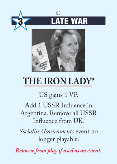 Along with Five Year Plan and Duck and Cover, a great US event for the USSR.  The Iron Lady is more explicitly and unconditionally favorable to the USSR, and a great choice for an AR1 Argentina coup.  Even if you have no intention of attacking Argentina, it’s a good source of initiative by creating a small threat for the US while you do something else with the 3 Ops.  The VP loss is minimal, the UK influence loss is laughable, and the only real consequence is that you can’t play Socialist Governments any more.  Which is unfortunate (since a Socialist Governments headline + AR1 Europe Scoring remains one of the best sources of VP for the USSR), but it’s a speculative cost, and at least you have Pershing II Deployed to substitute in its place.